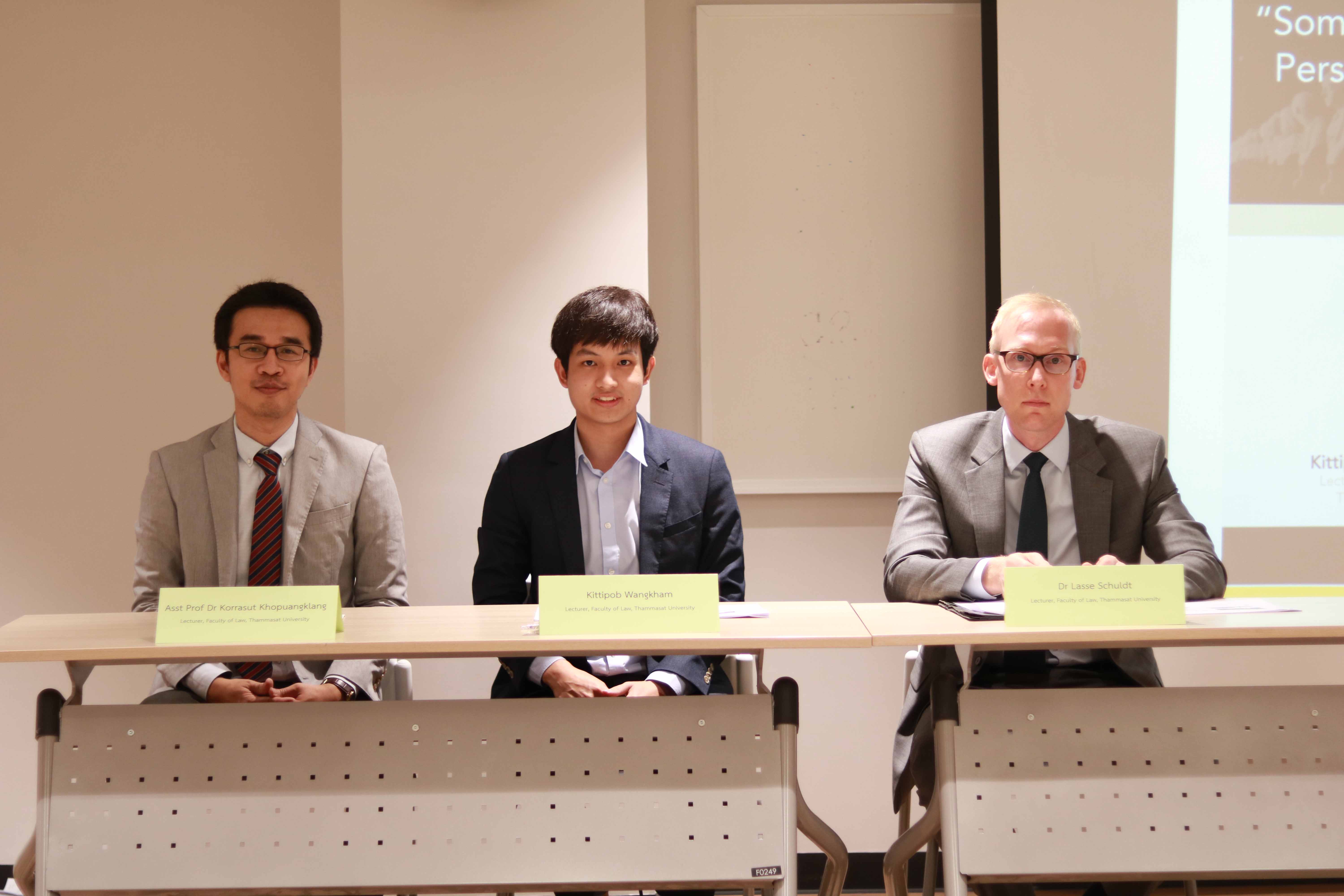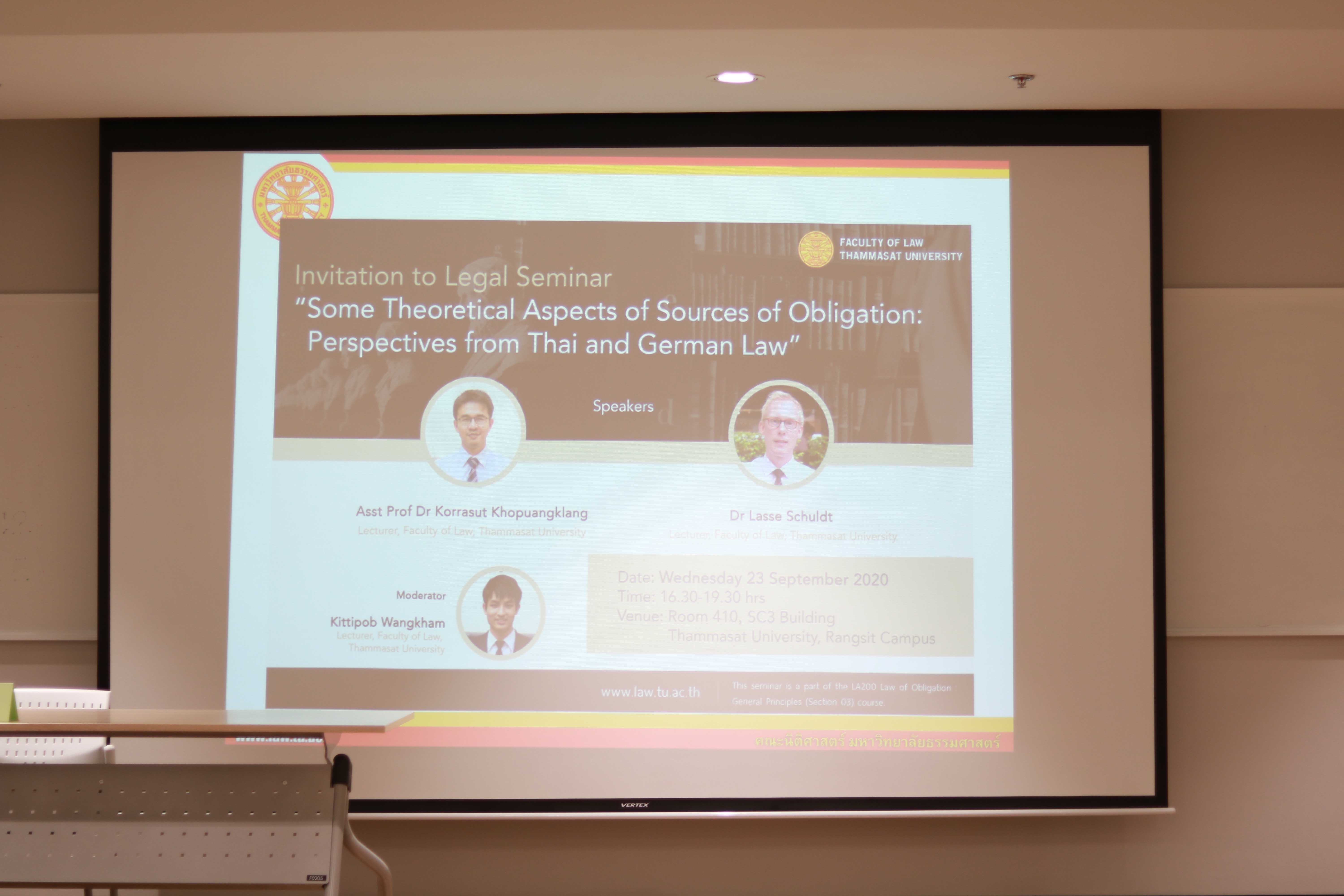 ศูนย์กฎหมายแพ่ง คณะนิติศาสตร์ มหาวิทยาลัยธรรมศาสตร์ ได้จัดเสวนาวิชาการ (บรรยายเป็นภาษาอังกฤษ) หัวข้อ “Some Theoretical Aspects of Sources of Obligation: Perspectives from Thai and German Law” ในวันพุธที่ 23 กันยายน 2563 ระหว่างเวลา 16.30-19.30 น. ณ ห้อง 410 อาคาร SC3 มหาวิทยาลัยธรรมศาสตร์ ศูนย์รังสิต โดยเสวนาวิชาการดังกล่าวเป็นกิจกรรมเสริมหลักสูตรการเรียนการสอนวิชา น.200 กฎหมายลักษณะหนี้ : หลักทั่วไป กลุ่ม 3 ผู้บรรยาย คือ ผศ. ดร.กรศุทธิ์ ขอพ่วงกลาง ผศ. ดร.สุรศักดิ์ มณีศร และอ.กิตติภพ วังคำ
