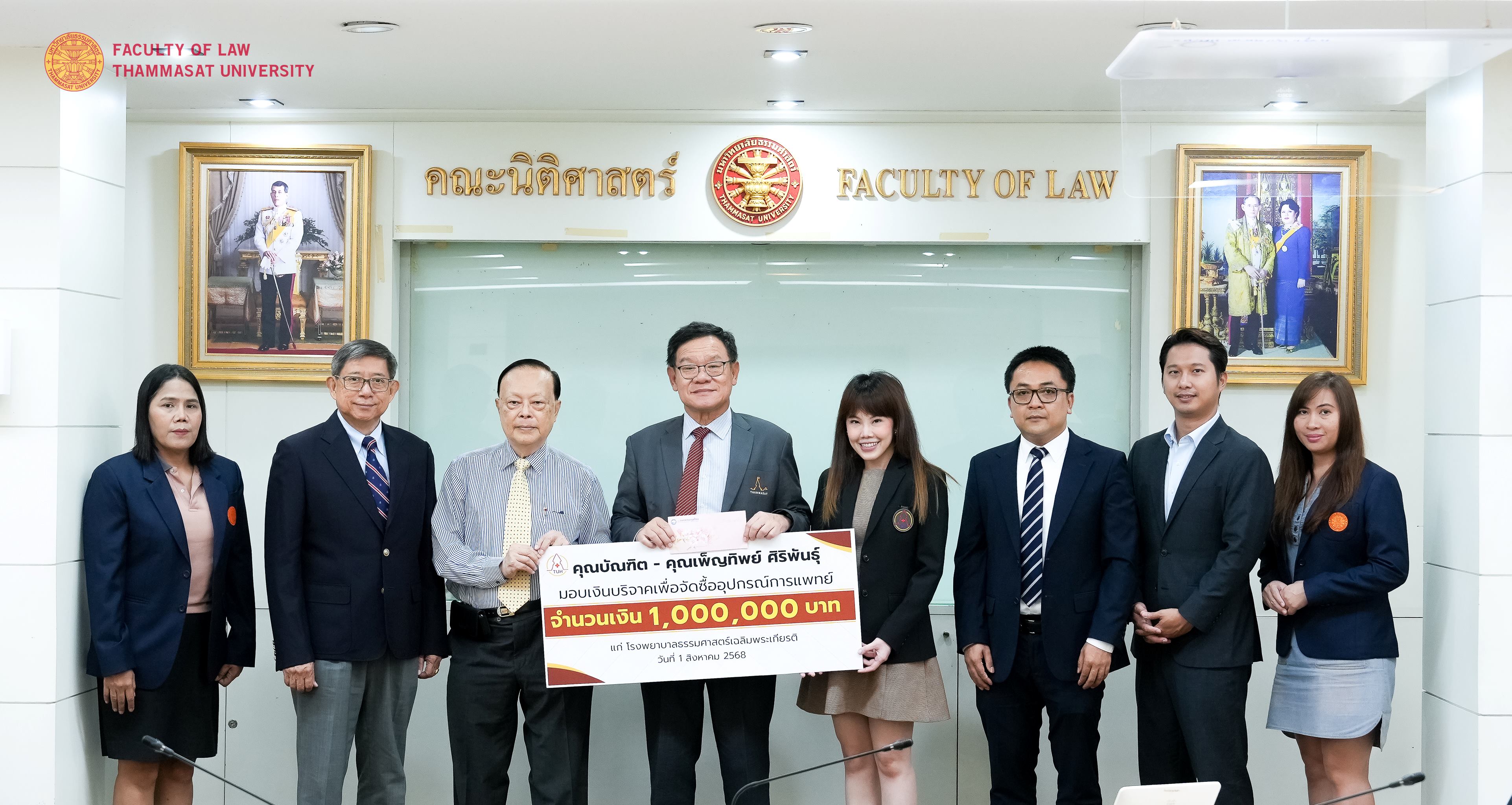 วันศุกร์ที่ 1 สิงหาคม 2568 คุณบัณฑิต ศิริพันธุ์ (ศิษย์เก่านิติ มธ. รุ่น 02) ได้มอบเงินบริจาคสมทบทุนเพื่อจัดซื้ออุปกรณ์การแพทย์แก่โรงพยาบาลธรรมศาสตร์เฉลิมพระเกียรติ โดยมีศาสตราจารย์ ดร.สุรพล นิติไกรพจน์ นายกสภามหาวิทยาลัยธรรมศาสตร์ (ศิษย์เก่านิติ มธ.รุ่น 21) และอาจารย์ พญ.มัลลิกา ชวนเสงี่ยม ผู้ช่วยผู้อำนวยการฝ่ายองค์กรและวิเทศสัมพันธ์ โรงพยาบาลธรรมศาสตร์เฉลิมพระเกียรติ เป็นผู้แทนรับมอบเงินบริจาค ณ ห้องประชุมจิตติ ติงศภัทิย์ คณะนิติศาสตร์ มหาวิทยาลัยธรรมศาสตร์ และมีคณาจารย์จากคณะนิติศาสตร์ ร่วมให้การต้อนรับ ได้แก่
